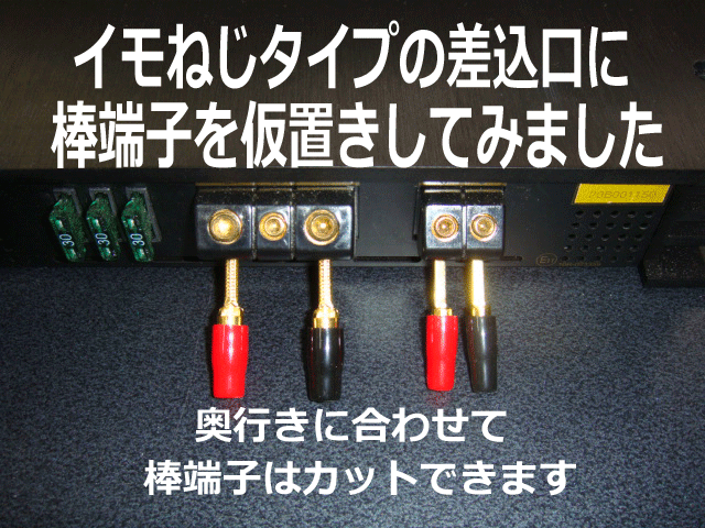この棒端子を使用することにより、ワイヤー部分は 傷付くことなく、しっかりとかしめる事ができ、棒 状の端子部分もイモネジでしっかり固定されますの で電流の効率も良くなります。